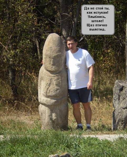 Это мой племянник Арсен, которому нужна постоянно кровь. Гемофилия. Ее можно озаглавить "Щас всех порву". Булава - подарочная для главы какого то банка, из за которого нам неудалось посмотреть представление. Но зато благодаря ему нам удалось прикоснуться к истории Украины. Мы посмотрели 2 судна времен Крымских войн - Запорожскую Чайку и Бригантину. Кроме этого насмотрелись всего и много, что было поднято вместе с этими судами. Так же нам провели экскурсию и показали эти суда. Запорожская чайка. Реставрируется. Взгляд "изнутри". Та же чайка, но вгляд снаружи. На фото дочь Крота - Александра и Арсен. По бортам свисают сосульки - это замещающая воду фигня типа пластмассы. Ею постоянно поливают и Чайку и Бригантину. Бригантина была полность закрыта каким то материалом. который сохраняет высокую влажность. Бригантину поэтому вы не увидите. Угадайте, кто там сверху! Не знаю, за кого Леша принял этого истукана! Это Скифский стан. Много курганов и всяческих девайсов.