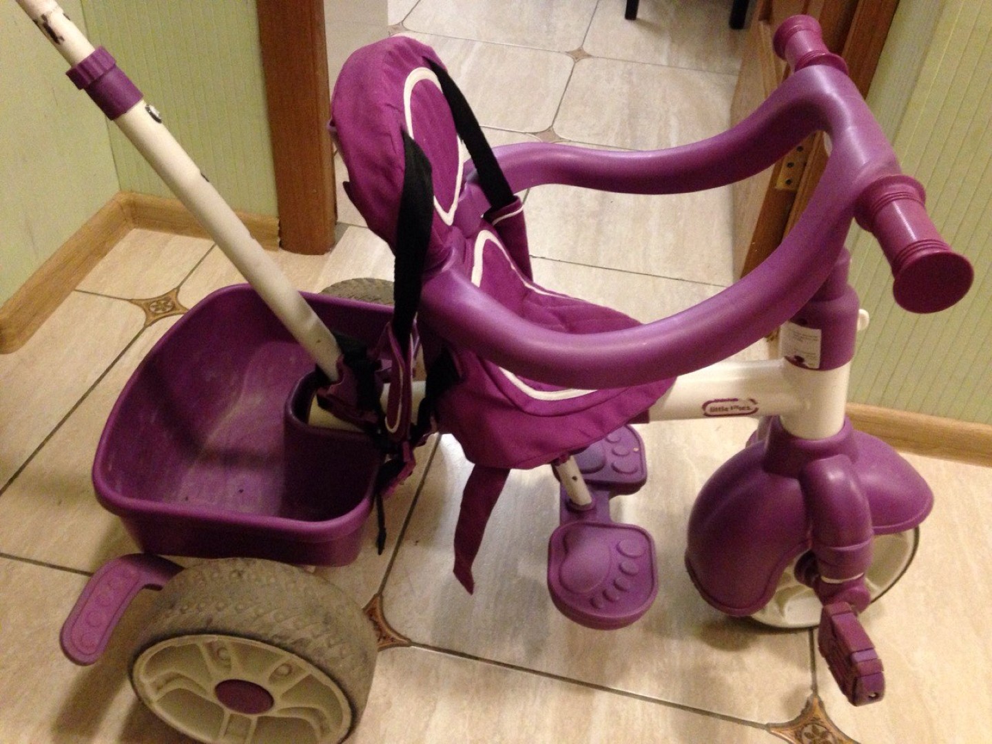 Велосипед трехколесный 4в1 Little Tikes Sports Edition Trike трансформируется в 4-х вариантах, соответственно этапам развития ребенка. 1-й этап (9+ месяцев) – переднее колесо фиксируется и родители управляют велосипедом. 2-й этап (12+ месяцев) – ребенок уже может крутить педали, но управляют велосипедом родители. 3-й этап (18+ месяцев) – теперь ребенок может поворачивать руль и крутить педали, но управлять велосипедом еще помогаю родители. 4-й этап (36+ месяцев) – ребенок катается на велосипеде самостоятельно без помощи родителей. Сидение велосипеда регулируется для удобства растущего ребенка. Для самых маленьких имеются ремни безопасности и защитный бампер, а для защиты от солнца предусмотрен тент.