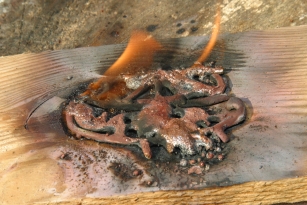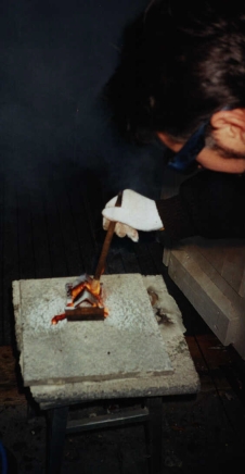 Фото сразу после сварки декоративных деталей выложенных на деревянной доске. Шлак еще не отбит. Хорошо видно распространение опалов на доске вокруг деталей. Не трудно заметить, что разбрызгивание и опалы не велики. Правда это от сварочного, а он на много менее мощный. Но и от Термита не на много шире будут следы. Можно, конечно, брызги специально организавать, как и любой фейерверк. Но в обычной ситуации окружающие заметят дым, а не огонь. И больше пугаться будут первого.