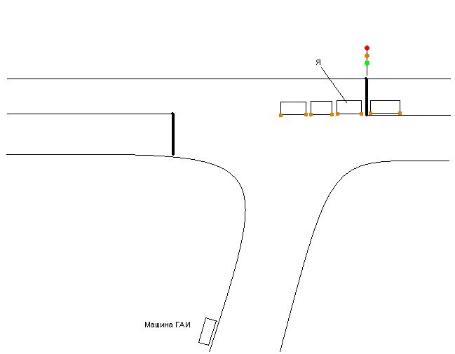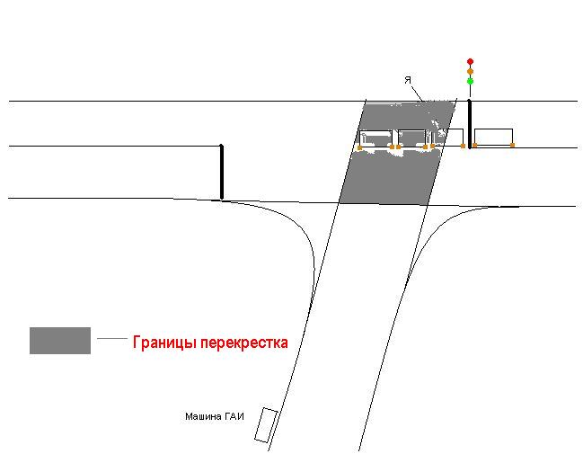 Борисполь, вечер, центральная улица, Т-образный перекресток. На одном из светофоров мне (как и многим другим) налево. Светофор горит для всех одинаковое время. Стоим на красный. Загорается зеленый, и три машины выезжают на перекресток, но повернуть не могут, т.к. идет встречный поток. Зеленый начинает мигать, загорается уже желтый, пролетает последний спешащий, и мы спокойно поворачиваем. Четвертая машина не поехала, поскольку стояла перед стоп-линией. Мы же втроем уже были на перекрестке. ГАИшники первых двоих пропускают, меня останавливают. Протокол, в котором проезд на красный. Так ли это? И как я все-таки должен был поступить - остаться стоять уже на перекрестке, или все же завершить маневр. В пояснениях написал, что выехал на перекресток на разрешающий сигнал, и завершал меневр. Прилагаю схемку (сорри за качество, лучше не получилось). ЗЫ: Поскольку были местные, то Права не забрали, повестку в суд не дали, отметку в талоне не сделали, хотя и грозились, потому что я им протокол порисовал в пустых местах . ЗЗЫ: Снимали на камеру, как люди проезжают этот перекресток. На мою просьбу показать, как проехал я - ответили, что мне повезло, и они меня не снимали.