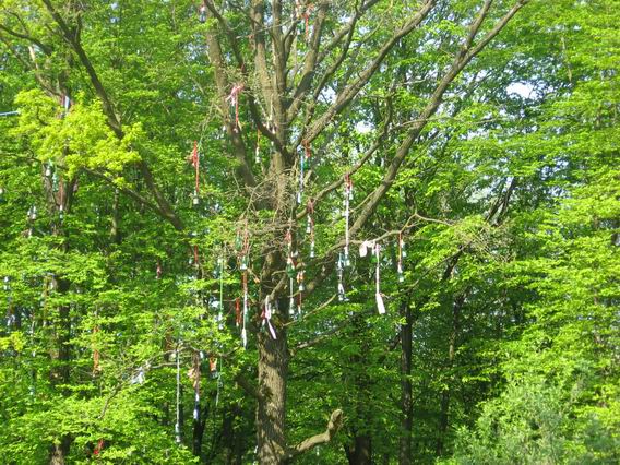 Кстати, обратно ехали через Хмельник. Хмельник - чистейший и весь застроенный курортами городок! Дальше на 16 км. Но местами лучше дорога. А около него такое вот дерево. Все в шампанском.