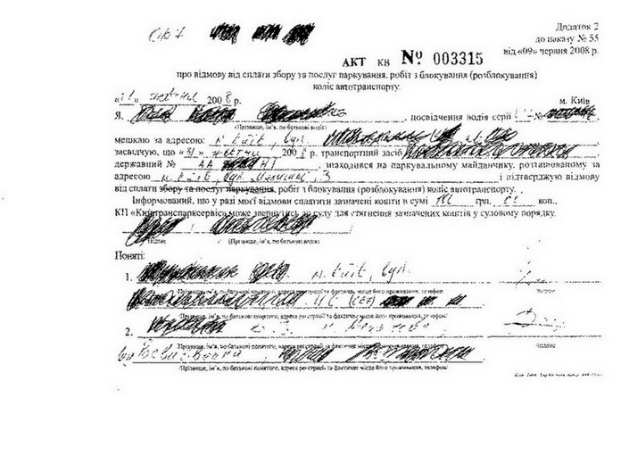 Пятница. 19-00. Ул. Малышко. Детский мир. Обычно там парковщиков как собак нерезаных. Но в этот раз по какому-то невероятному совпадению ко мне никто не подошел. Дойти до светофора, дождаться зеленого света, перейти дорогу, дойти до магазина, еще раз глянуть на машину и увидеть на колесе краба заняло несколько минут. Пятница. Кто не пьян, тот в пробке по дороге к семье (друзьям) или просто занят. Да и отвлекать народ своими пока еще не критичными проблемами не хотелось. Расстроенный, возвращаюсь к машине. Дальше диалог. Здравствуйте... Где парковщики резко затихарились…, союзпечать …, надо раньше было думать …., куда идут вырученные деньги и т.п. и т.д… Я. Ладно, пишите акт об отказе, снимайте. П. (Даёт мне эту писульку) Оплачивайте. Я. Что это за бумажка? П. Акт. (см файл)