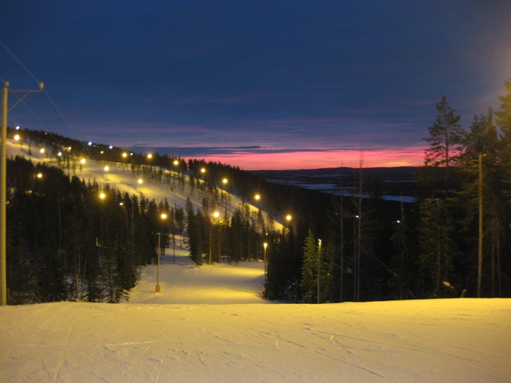 В основное время, конечно же катались ) Склоны, ВСЕ освещены всегда, трасс очень много, но т.к. основное время там ночь (день только с 11 до 14 дня), то катаешься все время в темноте. вид с центрального склона на Леви Сам курорт своими горками напоминает буковель - т.е. там сопки. Но трасс много, во все 4стороны света - что само по себе очень удобно, в зависимости от направления ветра можно всегда найти трассы с подветренной стороны и чувствовать себя комфортно. Трассы освещаются ВСЕ и с 10 утра до 10 вечера, подъемники работают с 10 до 20. Скипас 5 дней из 7 - 125 евро, детеныш нашару. Людей нет вообще на склонах - пусто. Съехав вниз, сразу уезжаешь на верх. Очереди нет даже из 1го человека))) приятно. Неприятно то, что большинство подъемников - бугели, и пусть даже очень скоростные, но ехать 1.5 километра задалбывает))) Есть 1 креселка , 2 гондолы типо кабина и штук 15 бугелей Трассы ровные, хорошие, красные ваще приятственные, на синие мы не лезли ибо неинтересно на черные тоже без особой необходимости не лезли ибо с дитем. Еще плюс в том, что не было плохо катающихся людей ваще. То есть именно того, что боишься в карпатах - что тебя снесет какой-то пяный олень или сноубрдист - нет. Очень безопасно себя чувствуешь, в общем, это да) Под каждый подъемником практически - гендель попить-поесть, а в основных 4х точках - прокат