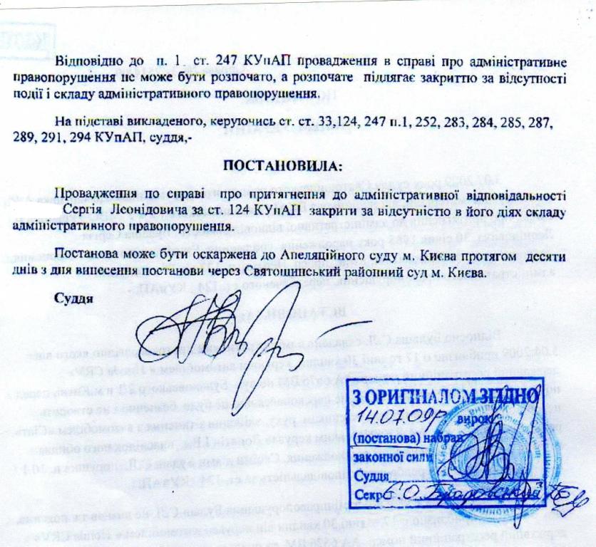 Итак, можете меня поздравить: я отстоял свою правоту в суде и суд вынес Постанову о закрытии дела при отсутствии в моих действиях состава административного правонарушения!!! Апеляция не постанову не подавалось, оно вступило в законную силу. Осталась вторая часть: теперь нужно доказать, что второй участник нарушил ПДД, подав в суд гражданский иск на него. Надо набраться терпения, в его страховую уже сообщил о своих намерениях и даже провели экспертизу повреждений.