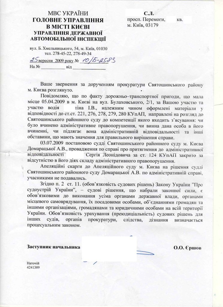 Прокуратура перенаправила материалы в ГАИ, через два месяца получил отписку и телефонный звонок, якобы зам. начальника Святошинского ГАИ сообщил, что мне необходимо обратиться к судье, выносившей решение по адм. делу, таков мол порядок, судья отправляет на дополнительное расследование в ГАИ, а там опять, делают новые замеры на месте ДТП и пр. Я был на приеме у судьи, она ответила, что суд рассматривает дела, а не заводит их, где ваш представитель? (адвокат, он помагал мне) и пожимает плечами: я все сделала. Адвокат посоветовал написать новую скаргу в прокуратуру и прикрепить ответ из ГАИ и вновь попросить открыть админ. дело на второго участника ДТП. Вчера прокуратура опять отправила в горГАИ. Пошел второй круг...