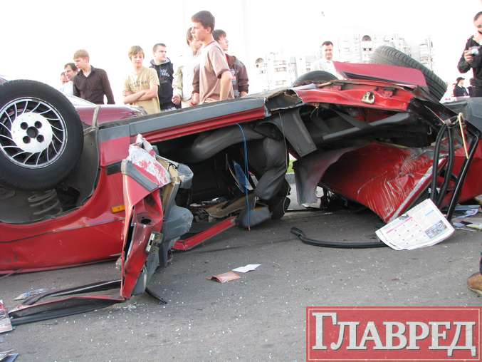 водитель «девятки» мчался по проспекту и, зацепив правым колесом бордюр, уже на неуправляемой машине врезался в столб, после чего «Жигуль» перевернулся на крышу. Уже в перевернутом состоянии он зацепил Opel Omega и Mitsubishi Lancer (который от удара развернуло на 180 градусов!).