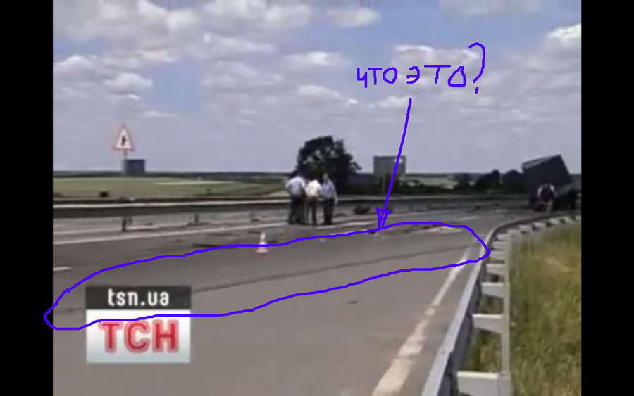 А обратили ли вы внимание на 25 секунде сюжета ТСН (на снимке)... Что это? Скорее всего тормозной путь бехи.... значит вошел в разрыв на большой скорости но не вытянул машину на выходе из поворота.... когда сообразил - ударил по тормозам (абс отключен возле ресторана) машина летит в одбойник бьеться правым крылом и рикошетом летит под грузовик.... помоему так....