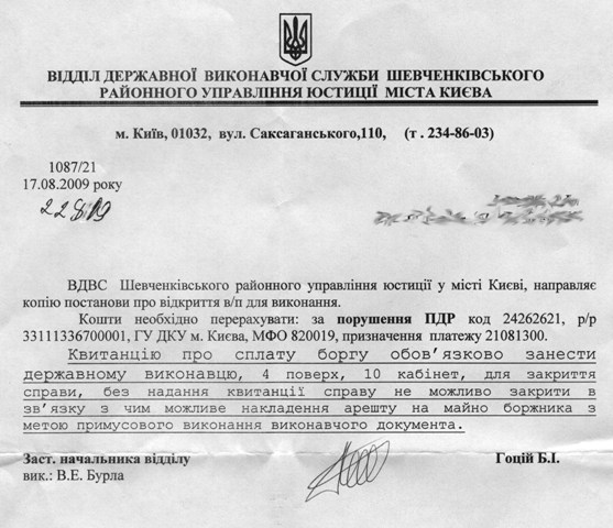 ИМХО На сопроводительном письме указан телефон отдела ДВС, в постанове - имя держвиконавця, который ведет Ваше дело. Уже созвонились? И адрес тоже указан. Они обязаны ознакомить Вас с постановой Шеченковского ВДАІ № 090126 от 21.03.2009. Увидите сами ее - тогда станет яснее, о чем речь и как дальше действовать.