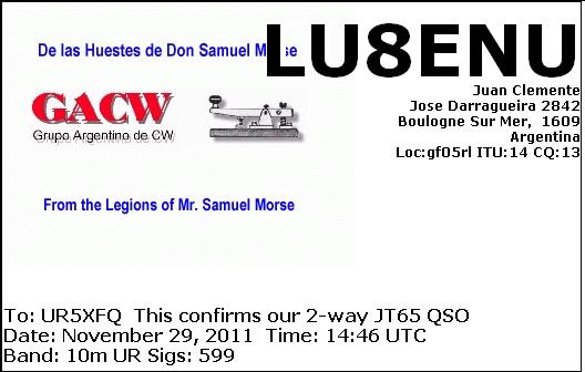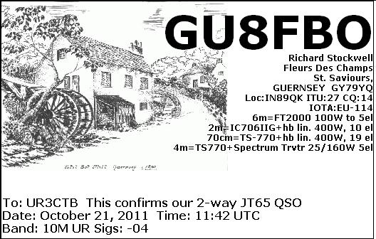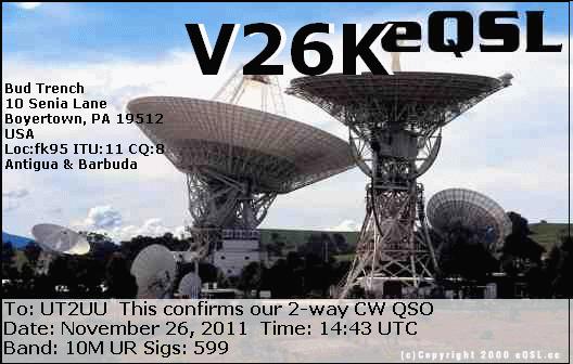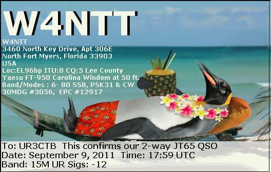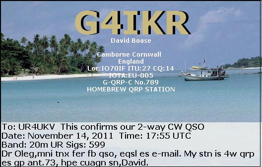 Может оно и не совсем в антиподское, но, блин, 4 ватта, при дистанции ~2500 км... 569/599 Специально уточнил письмом: Hello Oleg, Mni tnx fer ur e-mail es qso.My stn is all homebrew qrp es pwr is 4 watts. The ant is a homebrew 1/4 wave groundplane with 14 radials, mounted at ground level in my garden.It is good for dx.