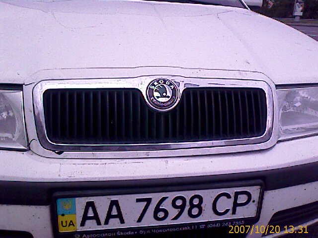 2001, чуть более 190000 км., белая, чешка, 20V Turbo, Elegance (кондей без климат-контороля). Состояние... м-м-м. Ходовая, двигатель, турбина, кондиционер, электрика/оника (глючит или датчик или указатель топлива, но на зиму это не принципиально, глючит только летом) в порядке, не бита (исключая мелких ДТП) Обслуживалась в Броварах. Салон не очень чистый, передний бампер просто устал весь подряпанный, поломана декоративная решётка радиатора. Ах да! Вмятина на пороге. Приезжай смотри, стоит днём на Мечникова (м. Кловская), ночует на Позняках. (О5О3II97I8) Если не считать вышесказанных недостатков, на машине ничего делать не надо. Ремень и ролики менялись на 154 000 км. Масло и фильтры менять через 1500 км. компьютер уже предупреждает. Продаю потому, что покупаю новую Октавию с TSI-мотором. Вот поломанная решетка.