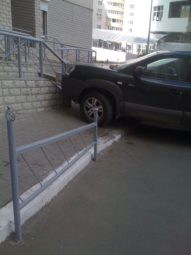 вот еще в соседнем дворе очень "опытный" водитель, максимально попытался освободить проезжую часть при парковке - расстояние до поручней входа в подъезд сантиметров 10