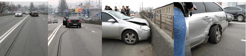Думаю виновницей этого ДТП послужила яма, которая образовалась в левом ряду (направление движения в сторону Подола). Если ехать по центру полосы, то яма находится как раз под левыми колесами - и яма довольно таки глубокая. Следы от шин там сразу за ямой. Предпологаю, что сначала рвануло колесо, а потом произошло все остальное.