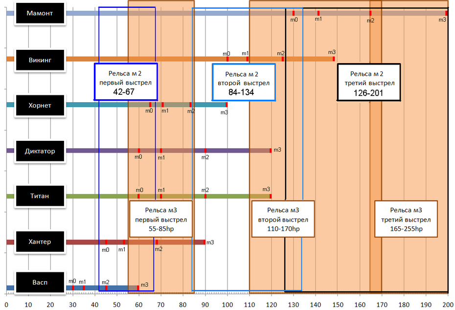 одна диаграмка чисто по броне, вторая - броня и скорость (голубой и зеленоватый - соответственно 1,2 и 3 выстрелы рельсы м2) оранж и коричневый - 1,2 и 3 выстрелы рельсы м3