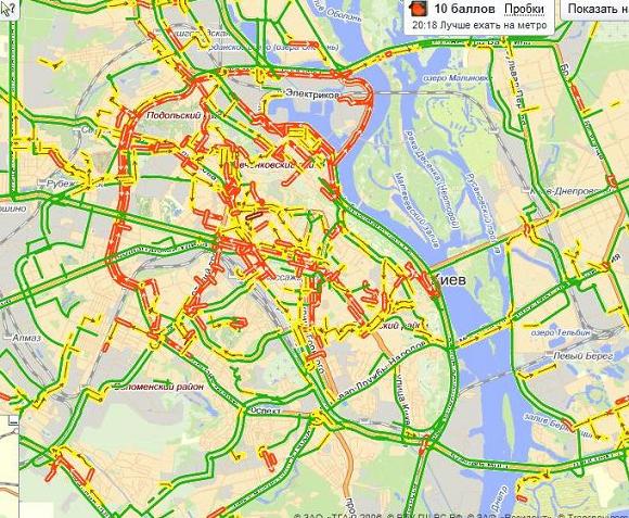 Поехал с Берестейки на Оболонь через Нивки-Сырецкую-Белицкую-Фрунзе-Вовчка-Луговую - и до точки назначения - 50 мин. Коллега по работе поехала на Троещину через Телиги - до сих пор стоит (выехала в 17.30), еще до моста не дотянула, жесть