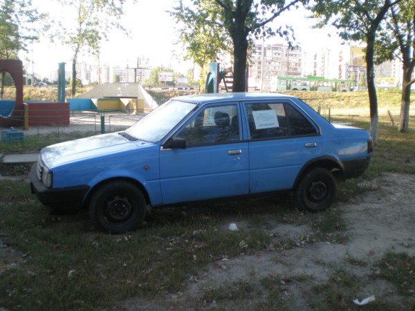 Ниссан Санни Б11 1985 год, синий, варен, подкрашен паскудненько, обработан антикором снаружи и внутри, двери не провисают, дизель 1.7. Из приятного: новые амморты, шаровые, еще там че-то по ходовой, коробка перебрана, новый аккум, заводится, центральный замок работает, в салоне чехлы новые - вроде так смотрится ничего. Хотелка 1500 уй так чтоб отдать (без торга)