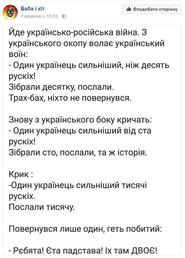 Сидит украинец, ловит рыбу. Поклевка, подсечка, рывок - на крючке золотая рыбка. Слушай, говорит украинцу рыбка, тебе сегодня неимоверно повезло. Отпускаешь - исполню одно желание. Любое. Сейчас. Украинец берет рыбку за хвост, бьет головой о камень и швыряет в алюминиевое ведро. Еще одна поклевка, еще одна добыча. И тоже - золотая. Лучше отпусти меня, сходу советует рыбка. Если отпустишь, исполню два твоих желания. Включая изощренные. Гарантия 100%. Вот тебе крест, а также мамой клянусь. Украинец вновь умерщвляет добычу и бросает в ведро к первой. Все уже поняли, что без третьей золотой рыбки сюжет не обойдется, а вот, собственно, и она: - Те, что до меня, - это любительницы. А я - самая могущественная. Исполняю три желания. 30 соток в подарок. До исполнения контракта готова жить в аквариуме. Просто не убивай. Украинец снимает рыбку с крючка и меееееедленно сжимает в кулаке, пока ее золотой живот не лопается, а глаза не выскакивают наружу липкими шариками. - Не треба говорити російською!