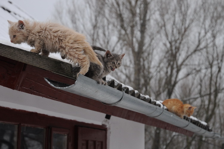 когда они сидят на крыше то сильно мяукают, иногда падают оттуда вниз - сразу умолкают, обедают и обратно через чердак на крышу.