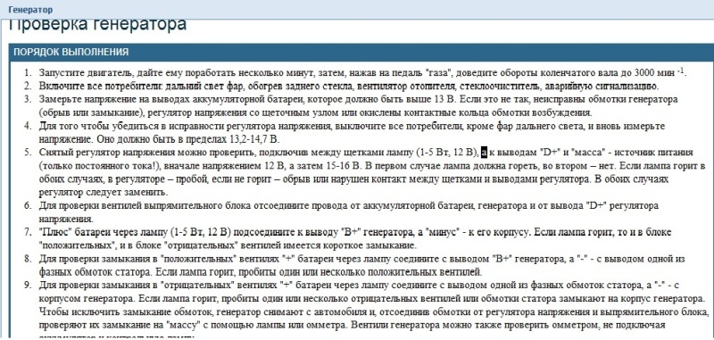 Контрольная лампа ярко горит или светится в полнакала при работе двигателя: 1. Проскальзывание ремня привода генератора - Отрегулируйте натяжение ремня 2. Поврежден регулятор напряжения - Замените регулятор напряжения 3. Повреждены вентили выпрямительного блока - Замените выпрямительный блок 4. Повреждены диоды питания обмотки возбуждения - Замените диоды или выпрямительный блок 5. Отпайка выводов обмотки возбуждения от контактных колец - Припаяйте выводы или замените ротор генератора 6. Обрыв или короткое замыкание в обмотке статора, замыкание ее на «массу» - Замените статор генератора.