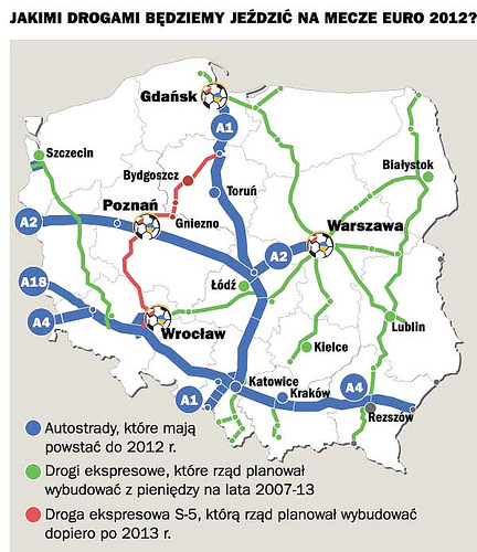 Думаю, полностью А4 только к концу 2012 достроют, но, возможно, успеют и до середины. У них срок строительства каждого участка 24 месяца. Только у окружной Жешува 18 месяцев. Сейчас строяться участок Starow-Tarnow (56,9 км) (http://www.a4szarow-krzyz.pl/ и тут) и окружная Жешува, т.е. А4 около Жешува (http://www.a4rzeszow-centralny-wschod.pl/ и тут).