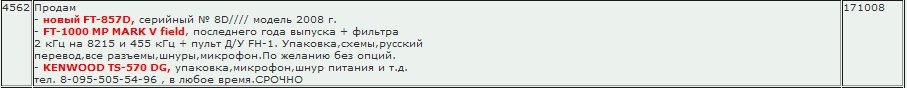 В связи с покупкой IC-7000 продаю кой какую технику. Итак продается: 1. УКВ аппарат автомобильный Кенвуд ТМ-732 двухдиапазонный 144/430 МГц с двумя честными приемниками, есть кросбенд, есть возможность подключения двух разных антенн, чистый японец, передает только в радиолюбительских диапазонах. Морда выносная так же как в 7800, и 8800 от Есу. Ну и денег хочу 200 американских рублей. забыл телефон оставить 0993237994