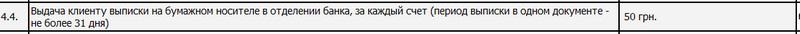 Уважаемый SerGolf,предоставление печатной выписки в отделении Банка по карте за текущий период (текущий месяц + 1 предыдущий мес.)составляет 3.00 грн. Предоставление печатной выписки в отделении Банка по счету за предыдущие периоды (больше текущего месяца +1 предыдущий мес.)составляет 30.00 грн.Подробно ознакомиться с тарифами Вы можете на сайте http://privatbank.ua/info/index1.stm?fileName=5_4_10_5r.html. С уважением, ПриватБанк.