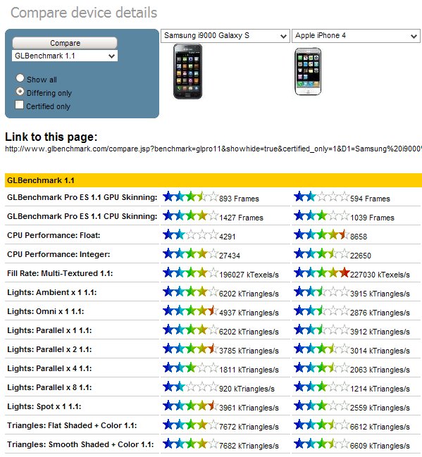 А на этом сайте можете выбрать любой телефон и сравнить. В среднем по графике i9000 почти в полтора раза быстрее 4g, в целочисленных операциях на ~10% быстрее, а вот в операциях с плавающей точкой - чуть ли не в 2 раза медленнее В общем, самсунгу ещё есть над чем поработать с прошивкой
