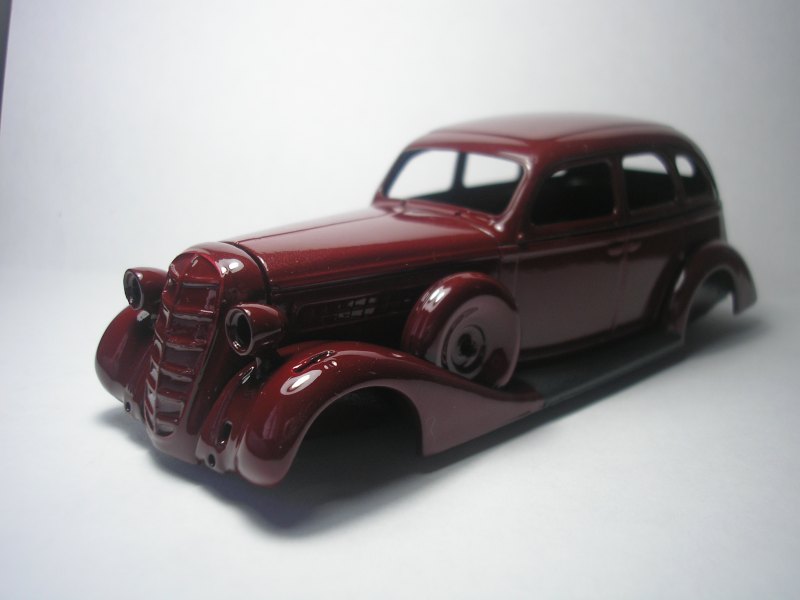 А во не совсем удачная попытка воссоздать ЗИС-101,немного промахнулись с решеткой радиатора ,нарастил крылья(стали более естественные).Покрасить решил в вишневый цвет,черных моделей и так уже много. Осталось покрасить колеса,салон,навести хром и модель готова: