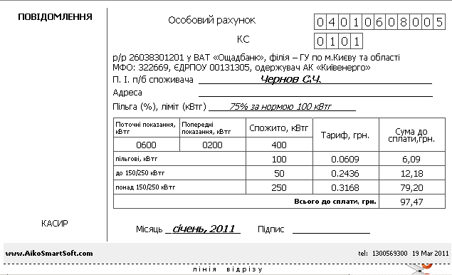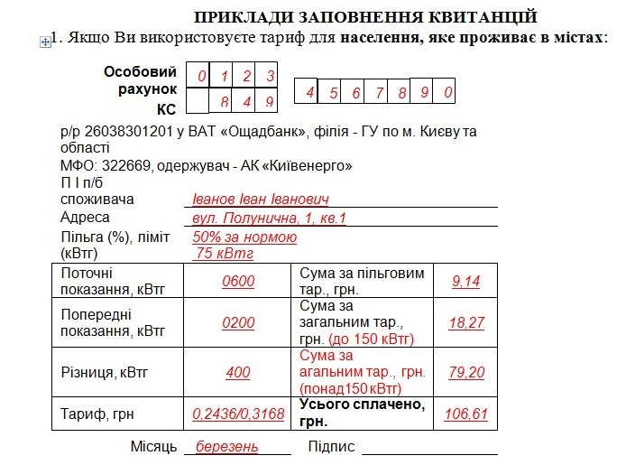 1. Для коректного ведення розрахунків споживач повинен щомісяця 1-го числа самостійно знімати показання лічильника і до 10-го числа поточного місяця проводити оплату за спожиту електроенергію. 2. Для цього необхідно заповнити квитанцію та обов’язково внести дані в такі поля: • особовий рахунок та КС («контрольна сума» — унікальний шифр особового рахунка, який використовується банком під час формування електронного реєстру); • прізвище, ім’я, по батькові та Ваша адреса; • за наявності пільги обов’язково зазначити розмір знижки (у відсотках) та ліміт (у кВтг); • у графі «Поточні показання, кВтг» записати правдиві поточні показання лічильника; • у графі «Попередні показання, кВтг» зазначити останні сплачені за квитанцією показання лічильника; • у графі «Різниця, кВтг» зазначити кількість спожитої електричної енергії, яку можна розрахувати, віднявши поточні показники лічильника від попередніх; • у графі «Тариф, грн.» необхідно записати діючий тариф відповідно до вашої категорії споживачів та обсягу споживання. Якщо Ви перевищили встановлений обсяг, через дробову риску зазначте два тарифи: тариф з обсягом споживання до 150/250 кВтг / тариф з обсягом споживання понад 150/250 кВтг; • у графі «Сума за пільговим тарифом, грн.» якщо у Вас є пільга, потрібно зазначити суму до сплати за пільговим тарифом відповідно до категорії пільговика та норми; • у графі «Сума за загальним тарифом, грн.» записують суму до сплати за загальним тарифом в обсязі до 150/250 кВтг відповідно до тарифного плану; • порожню графу умовно названо «Сума за загальним тарифом, грн. (в обсязі понад 150/250 кВтг)». У графі поряд з нею потрібно зазначити суму до сплати за загальним тарифом в обсязі понад 150/250 кВтг відповідно до тарифного плану; • у графі «Всього сплачено, грн.» зазначають загальну суму до сплати за спожиту електричну енергію, яка складається із «суми за пільговим тарифом, грн.» + «суми за загальним тарифом, грн. (до 150/250 кВтг)» + «суми за загальним тарифом, грн. (в обсязі понад 150/250 кВтг)».
