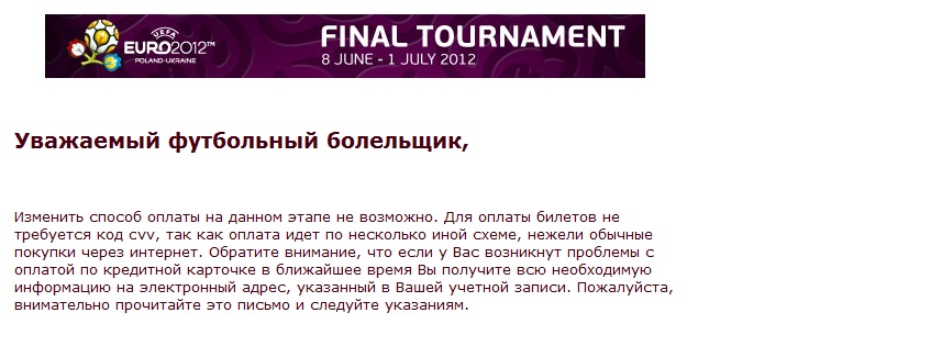 Уже слышал, что произошла куча траблов у людей с оплатой картой! Во-первых, УЕФА не работает с ВИЗА Электрон, мимимум Классик, да и с Классиком куча проблем! Разговаривал с другом, работает нач. карточного управления, так говорит, что с утра разбираемся с кучей такой херни! А шансов оплатить у людей больше не будет! Так что вскоре еще билеты будут, неудачники!))