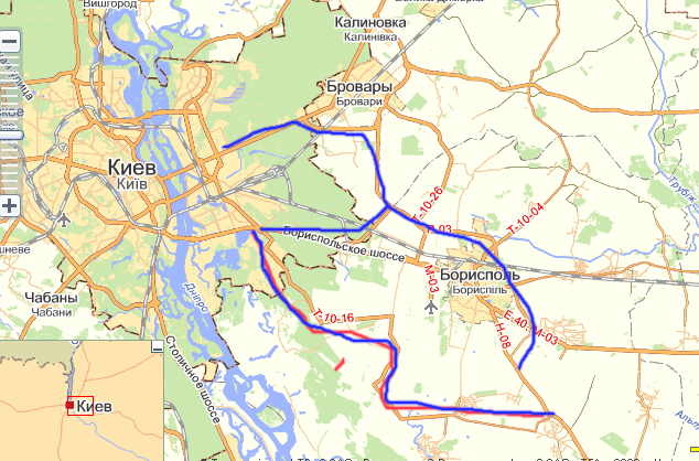 Вообще-то если вам Борисполь со стороны Харьковской объехать, то тут очень простой и удобный путь есть: отак или отак. Дорога там хорошая, ровная, указатели по периметру вроде все есть, правда не двухполоска и фур там много. При свободном Борисполе (раненько утром, часиков до 7-ми) быстрее не получится, но при загруженном - должно быть намного. Ну и спокойнее: ни маршруток, ни светофоров.