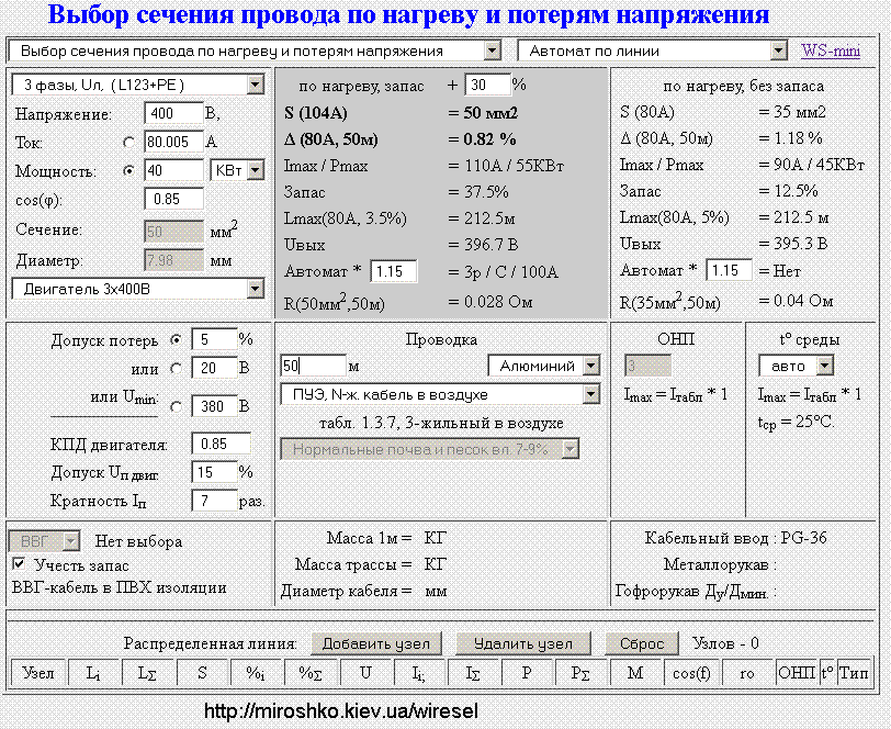 Выбираем: Алюминий, ПУЭ, N-ж кабель в воздухе, Автомат по линии Вводим: Мощность 40КВт, Длина трассы 50м