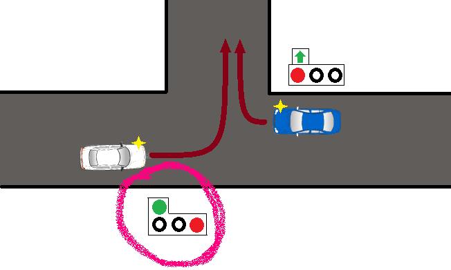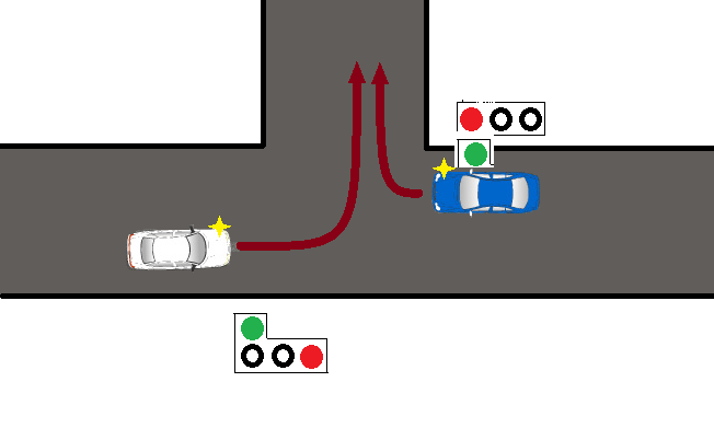 Регулирование на перекрёстке проектируется так, чтобы одни потоки стояли, а другие ехали. Не очень логично я думаю делать стрелку влево для белого, включенную вместе с включенным зеленым для синего, иначе смысл такого регулирования ? Следовательно белый автомобиль едет на свою зеленую стрелку, посматривая по сторонам дабы никому не пришлось изменить свою скорость и направление, синий автомобиль стоит на свой красный свет и может продолжить движение по картонной стрелке ТОЛЬКО пропустив ВСЕХ остальных участников движения. У синего автомобиля нет права ехать на стрелку при наличии поворачивающего белого, а раз у него нет такого права, то он должен остановиться, а раз он стоит то белый может двигаться, т.к. из-за него не будет изменена скорость движения и направление у синего автомобиля. Примерно так