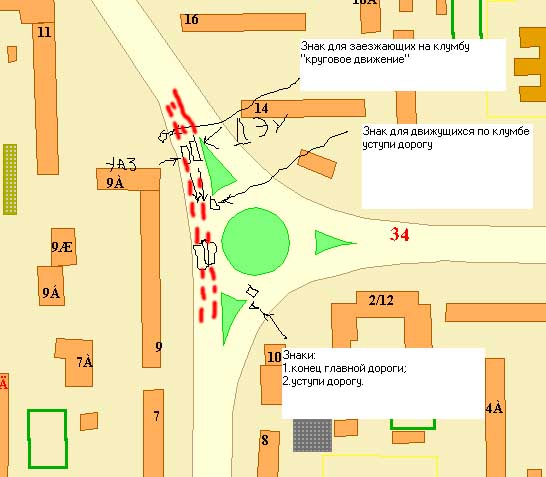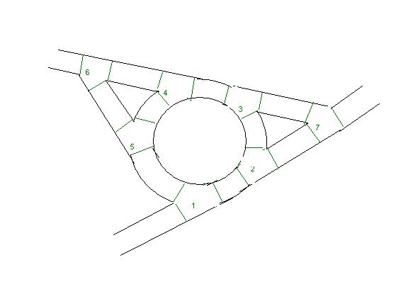Теперь о круговом движении. На картинке пример системы перекрестков с круговой организацией движения. Я делеными линиями обозначил границы перекрестков, а также пронумеровал их. Всего их 7. Может не самый лучший пример (уже лень дыло "вылизать", может позже, если вопросы еще останутся)