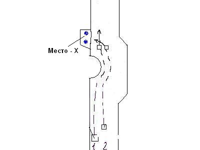 Где два автомобиля едут по дороге, при этом траектория движения авто1 совпадает с направлением дороги, а авто 2 изменяет свою траекторию движения относительно дороги, по какой причине, неважно, допустим в местеX - стихийный рынок или к примеру, извините, туалет. У кого преимущество на приведенной схеме, думаю очевидно - авто1. Уверен, возражать не будете.