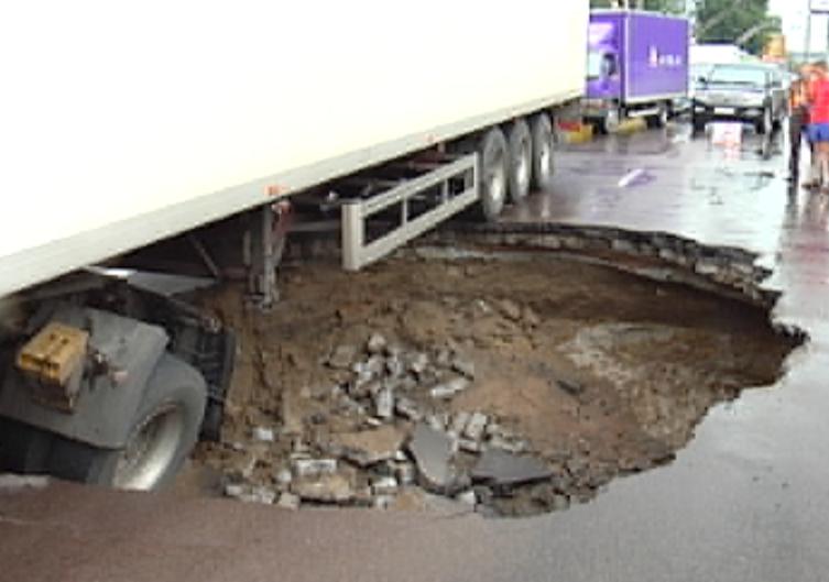 На Телиги, перед съездом к стадиону "Спартак" нехилый такой провал образовался. Прямо под фурой. Из центра пробка, в сторону Дорогожичей проехать можно было.