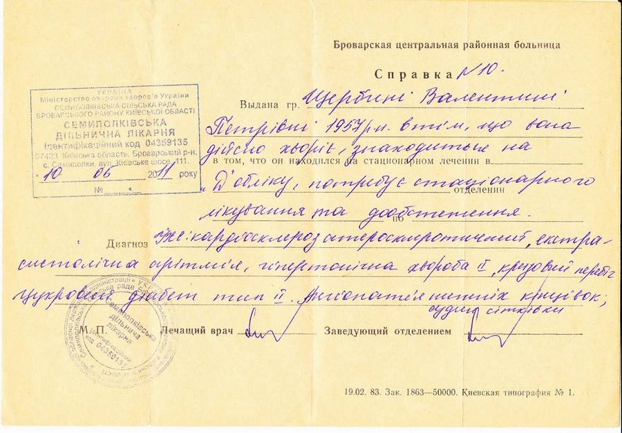 Ей нужно лечь в больницу на стационар и всерьёз заняться лечением, но денег на лекарства нет. Плюс нужно нормальное питание (диета). Она живет в селе Семиполки Броварского района Киевской области с братом (тоже инвалид).