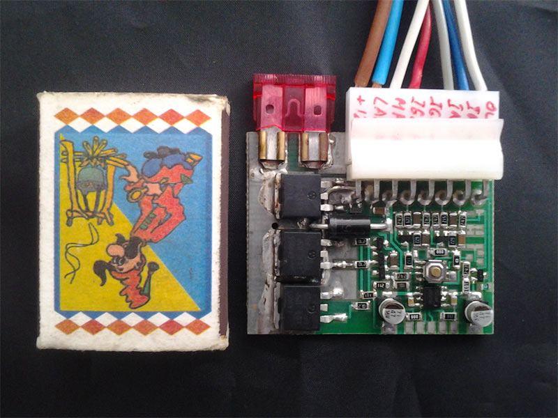 «+» устройства: 1. Компактность устройства (см. фото). 2. Плавное вкл/выкл ДХО. 3. Возможность регулировки уровня яркости ДХО. 4. Регулируемая отсрочка перед вкл. ДХО. 5. Возможность принудительного вкл./выкл. ДХО. 6. Встроенный предохранитель.