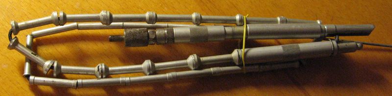 Завалялись парочка антен з носимих армійських радіостанцій. Довжина 149 см, всередині кільцевих секцій трос, вертикальне положення фіксується натягом троса у коліні і опуском стопорної трубки. Без фіксації антена вільно скручується. Недорого.