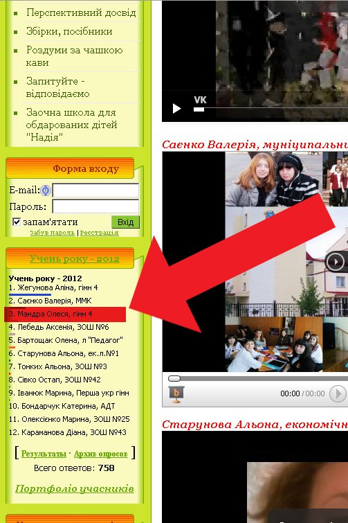 Доброго времени! Буду действительно благодарен всем, кто найдет время (и желание) проголосовать за Лесю Мандру (4 гимназия) в левом углу (под меню) по адресу http://zavuch.at.ua Работа действительно интересная (можно познакомиться ra-lira.com/gora.rar) Зарание всем - много спасибо!