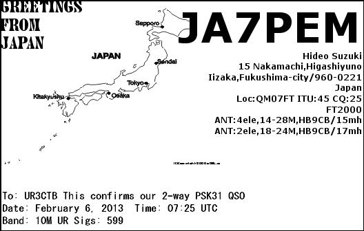 13/02/2013 "попали" в интересный волноводик с VK3KCX on 10m C Дэвидом работаем каждое утро, в psk-31 на 10-ке, в среднем по 15-20 минут! Принимаю его всегда c уровнем s2-s3 балла по с-метру, что для цифры в принципе достаточно но 13 числа сигнал постепенно возрастал с s-0 до максимума S-9, причем в обе стороны Перешли в SSB, прохождение там продержалось где-то 10 минут, после чего сигнал внезапно пропал, как написал Дэйв в письме : "propagation finished very quickly, just like somebody closed the door", ...как будто кто-то закрыл дверь -)) p.s. VK3KCX setup: TRX - IC-7000, ANT VERT "HUSTLER-BTV", PWR 60W DIGI / 100 SSB http://youtu.be/bGJAzjfQ01k http://youtu.be/luCwEszCwKc http://youtu.be/VSS65i_8nbc http://youtu.be/J1WB95CR4W8 http://youtu.be/FYoRmWIQHXk 10m fun 73 de UR3CTB