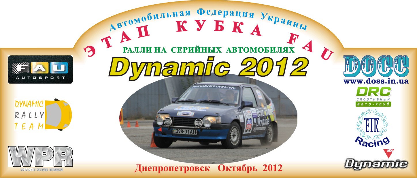«Днепропетровским Областным «Спортивным Союзом» 13-14.10.2012 в Днепропетровске, при поддержке Федерации Автоспорта Украины и Главного Управления МВД Украины в Днепропетровской области состоится Этап «Кубка ФАУ на серийных автомобилях» «Dynamic 2012» (ралли), в котором может принять участие практически любой желающий на стандартном легковом автомобиле. (Єкипаж 2 человека - пилот и штурман) Легенда Ралли проложена по асфальтовым и грунтовым дорогам общего пользования дистанцией в 170 км, также в нее включены несколько асфальтовых участков по скоростному маневрированию (слаломов). Ралли будет проходить на территориях Днепропетровского, Днепродзержинского, Петриковского районов, Днепропетровской области. Старт ралли состоится 14 октября (воскресенье) в 10:00 в городе Днепропетровск, на территории «Автомобильного Кинотеатра» по адресу ул. Курчатова, 10 (Центральный Автовокзал). С программой ралли, регламентом и обязательными требованиями к участникам и автомобилям, можно ознакомится на сайтах: http://www.fau.ua/rus/calendar/2012-10, http://www.etr.in.ua, http://www.drc.in.ua и других авто форумах.