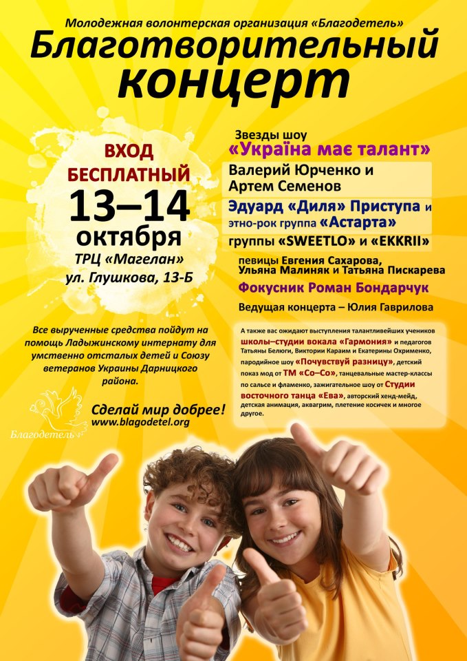 13-14 октября состоится благотворительный концерт в ТРЦ "Магелан" по адресу: ул. Глушкова 13-Б