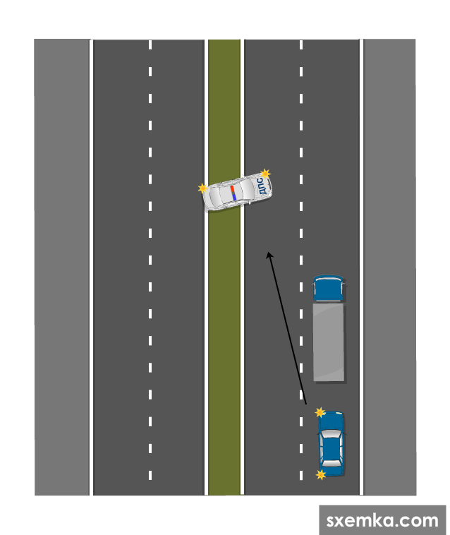 Я имел в виду то, что, возможно, авто ДСО выезжало с разворота - либо в левую полосу, либо приостановилось, высунувшись в левую, чтобы пропустить что-то (фура на схеме) в правой. Из-за которого резко на опережение выскочил праворульный Ниссан.. Но это всё, конечно, чисто гипотетически. Важен результат экспертизы о том, стояло авто ДСО или двигалось...