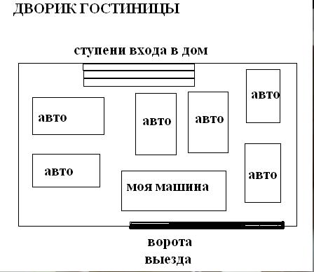 Согласен, что это крайняк, но "...от сумы и от тюрьмы..." Предлагаю ребус, который был этим летом - я на паркуюсь во дворике гостиницы, вне территории оставлять машину стремно, девочка-администратор может где-то лазить и не дать инфы о запарковавшихся. Я подумал и решил, что записка будет уместна. Схему дворика прилагаю.