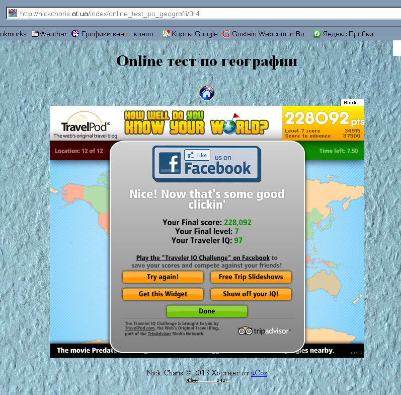 В этой штуковине есть возможность выбирать континенты. Начал с Европы, результат: Score 109 520 Level 8 из 8 Traveller IQ 122