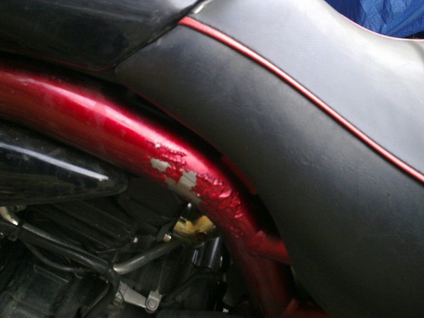 Могу сказать только одно - краска эта однозначно родная. Может, она на корейском мотоцикле и не самого лучшего качества. Кстати, под ней вот то серебристое - это не голый металл, а какое-то покрытие, и несмотря на сошедшую краску, рама не ржавеет. Но чёрт возьми, не должно такого быть и столь быстро от обычного бензина! И не было, потому что в принципе ведь при заправке мотоцикла пролитый бензин - это явление, которое случается, конечно, не каждый раз, но не из ряда вон выходящее. Тем более данный мотоцикл из юбилейной лимитированной серии (1000 штук, в Украине таких, насколько я знаю, около десятка), и логично было бы предположить, что на такую серию производитель вряд ли бы пустил откровенно некачественные материалы... Сошедшая со снегом краска - это удел самостоятельно покрашенных, и некачественно, машин А насчёт смыва краски - так ехать сильно далеко