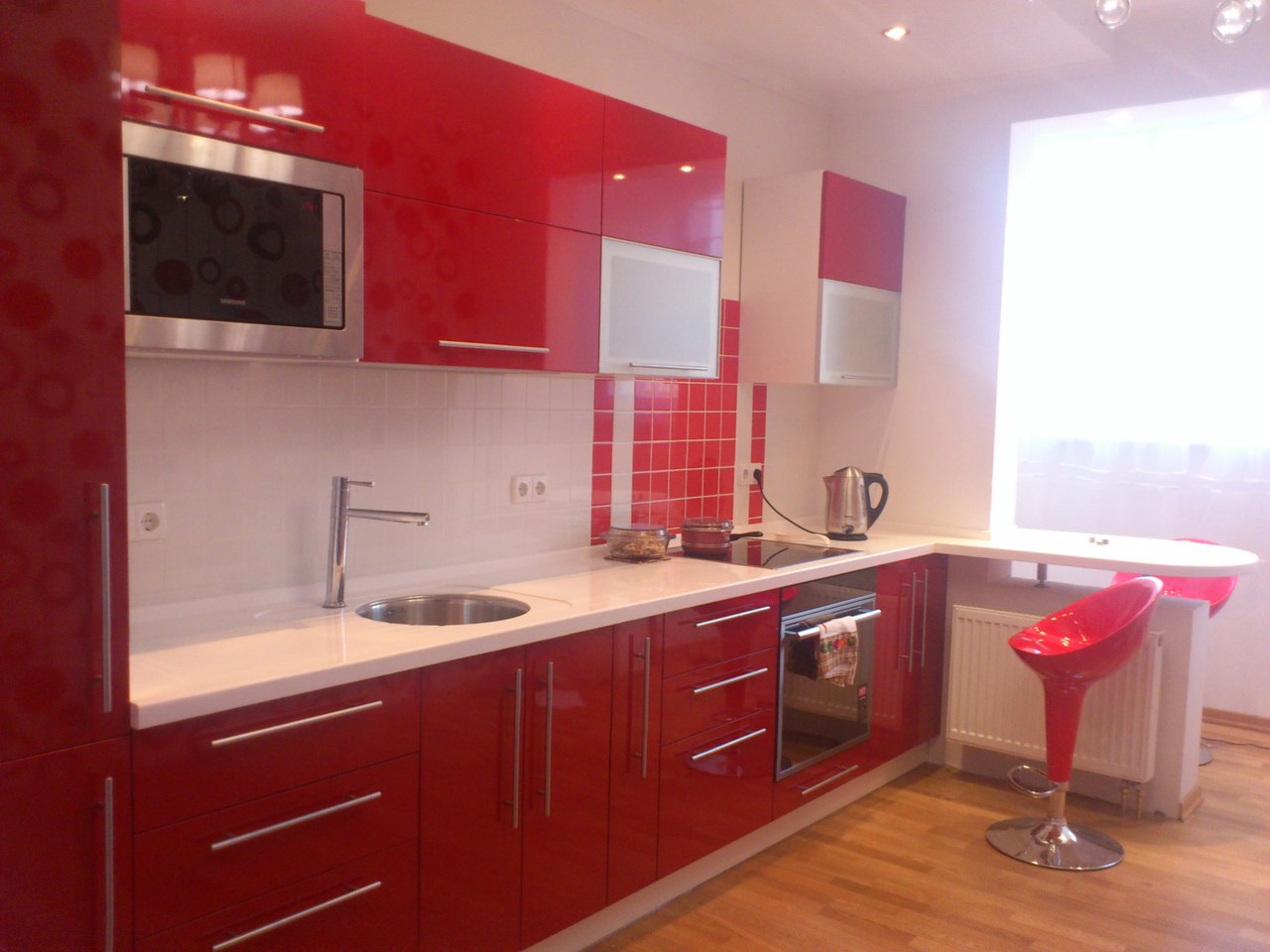 Сборка кухни 1 числа по идее , потом покажу когда соберут. По факту должно получится что-то такое . Но это фотка из инета, чуть другая планировка шкафов но....цвет красный феррари глянец ...да, Мне сделали скидку еще на барный стул, бесплатно получился в подарок.