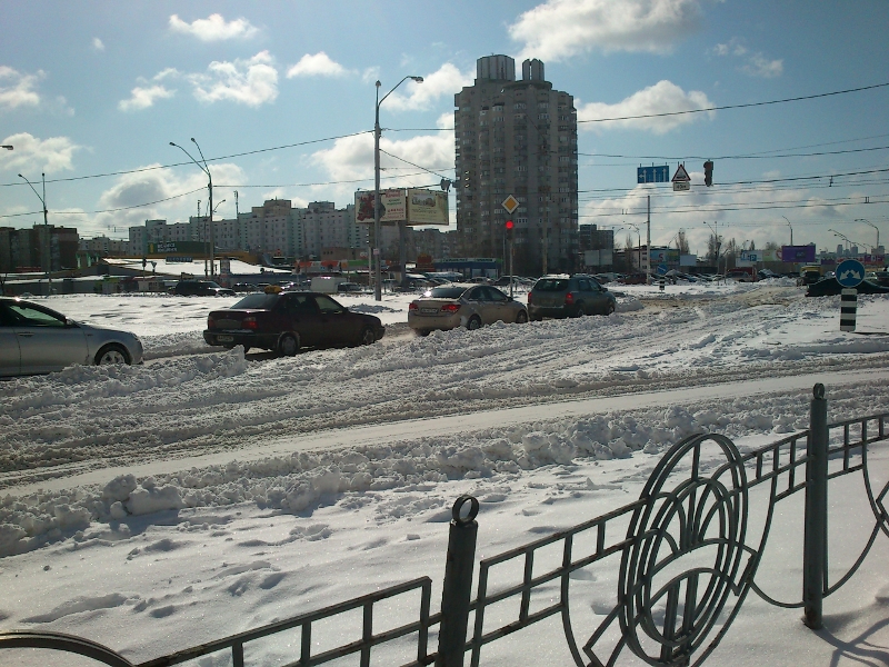 сегодня на работу, норм ровно за час, с харьковского на берестейскую через корчеватое, в обычный день без снега не всегда так получаеться, конечно Бажана радуэт, столичка не очень переезд на Науки терпимо, сама науки 1 полоса, московская жесть даж ни крама асфальта не видать, Краснозвездный, в полторы полосы, на Кар. Дачах, БТР пытаеться Добаную Фуру вытащить на подьеме, Победы видать только растянули, вот такие дороги...