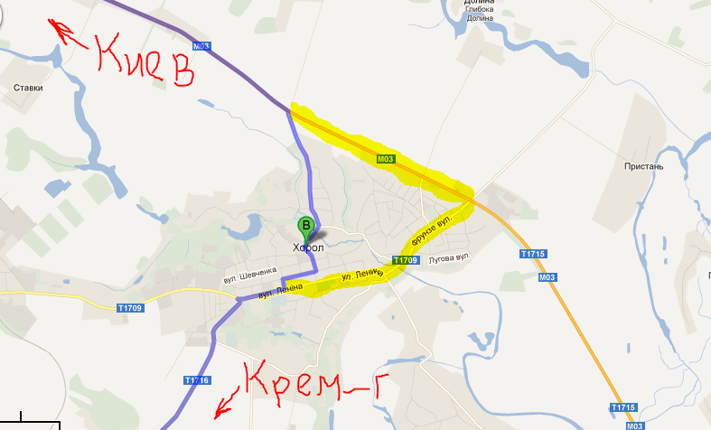 UPD: если на гуглмапсе глянуть со спутника, то по желтой линии на повороте справа есть "Хорол АС2", я так понимаю - автобусная станция - мне там поворачивать?