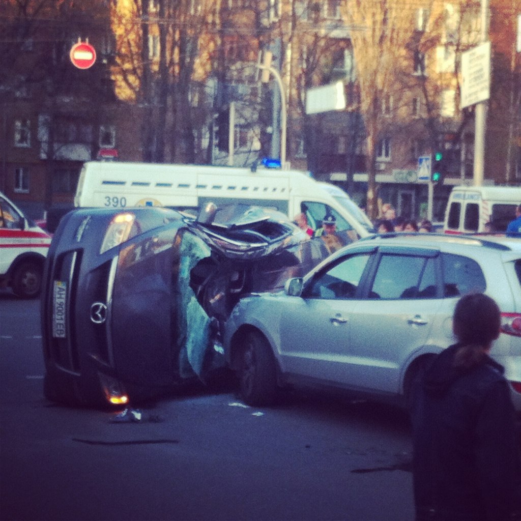 Я там проходил мимо - Мазда CX лежала на боку, крыша у нее была смята от удара об другой кроссовер со стороны Щорса. По характеру повреждений похоже было, что она летела и приземлилась крышей на чужой передок. Крыша была вмята до уровня подлокотника, так что если водитель в Мазде уцелел, то ему крупно повезло. Через люк еще виднелось детское кресло, прижатое крышей. Стояли три скорые, пожарка, на асфальте кровь.